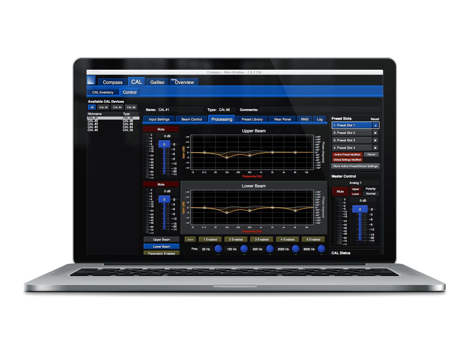 Compass provides a graphical user interface that displays detailed information and controls all device settings including GALAXY Control Pages, Parametric and U-Shaping EQ, AVB Network Settings, Delay Integration, High and Low Pass Filters, CAL Beam Control, and RMS.