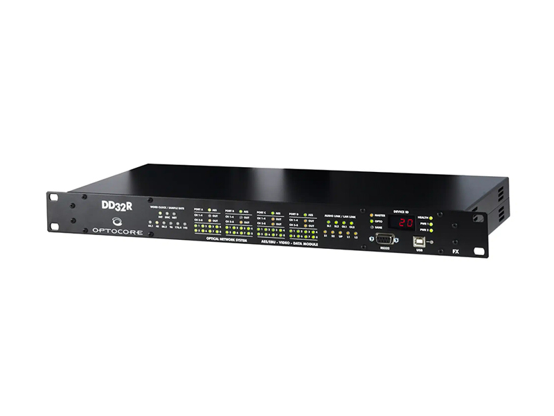 DIGITAL I/O MODULE – The DD32R-FX is designed to function as a digital interface, wherever AES/EBU ports are required in an OPTOCORE OPTICAL or CAT5 SANE DIGITAL NETWORK SYSTEM. The 32 principle ports feature the unique possibility of any combination of AES/EBU inputs and/or outputs. With the other Optocore and SANE devices, the DD32R-FX offers a great flexibility to build the network exactly suiting an application's need. With Optocore microphone preamps (X6R), the DD32R-FX enables the gain control of the preamps on stage from a Yamaha digital console at FOH. These common installation interfaces provide a simple and cost-efficient connection to other audio equipment.